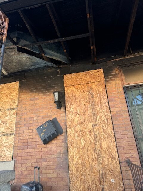 •Fire damage has affected the front porch of the property